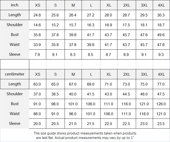 | inch | XS | S | M | L | XL | 2XL | 3XL | 4XL |